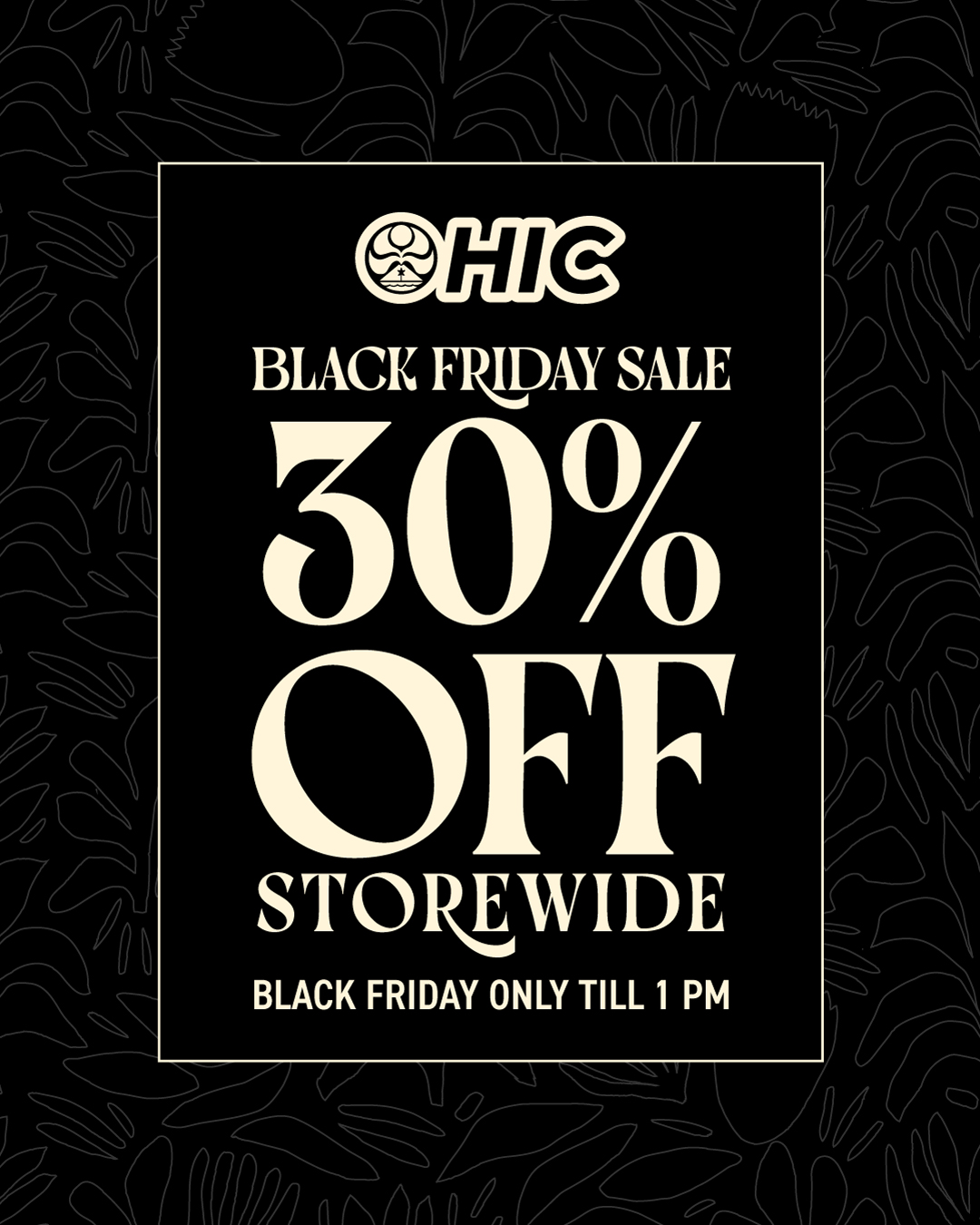 Take 30% off storewide November 28th only until 1pm. Excludes surfboards, bodyboards, HIC x Aloha Collection, and Yeti. See store for details.